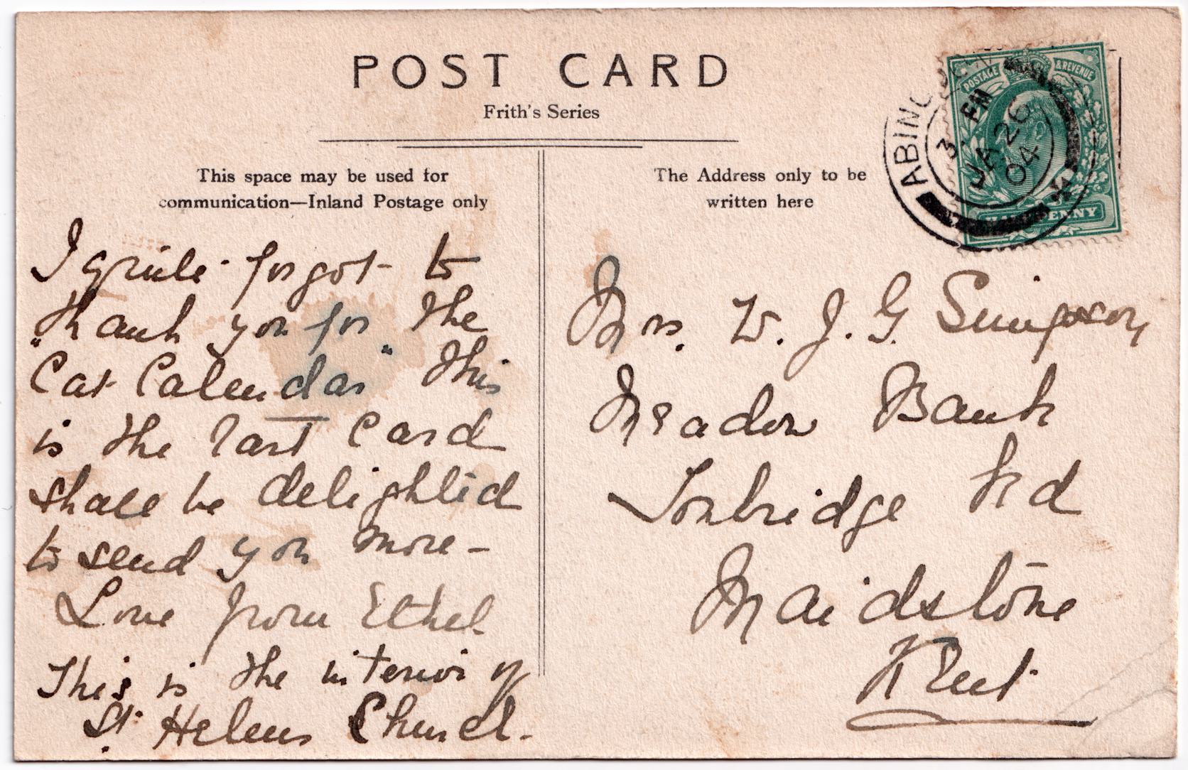 | Message | I quite forgot to thank you for the cat calendar. This is the post card shall be delighted to send you more - love from Ethel. This is the interior of St Helen's Church. |