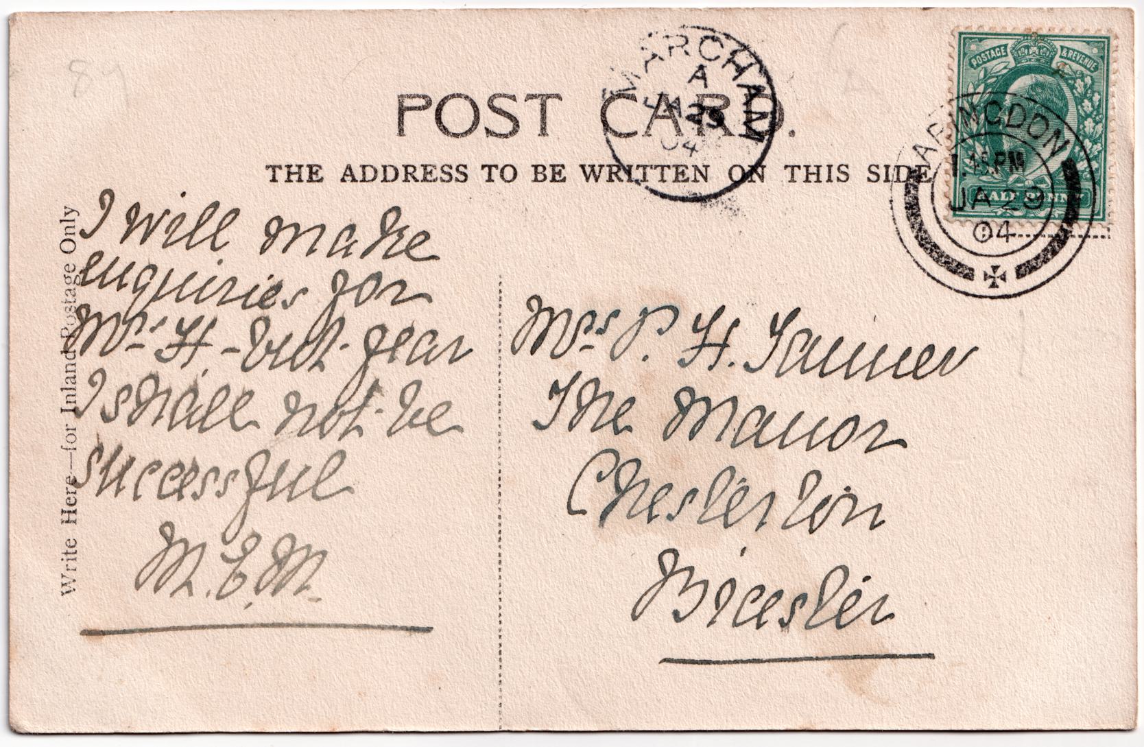| Message | I will make enquiries for Mrs ? but fear I shall not be successful. M. & M. |