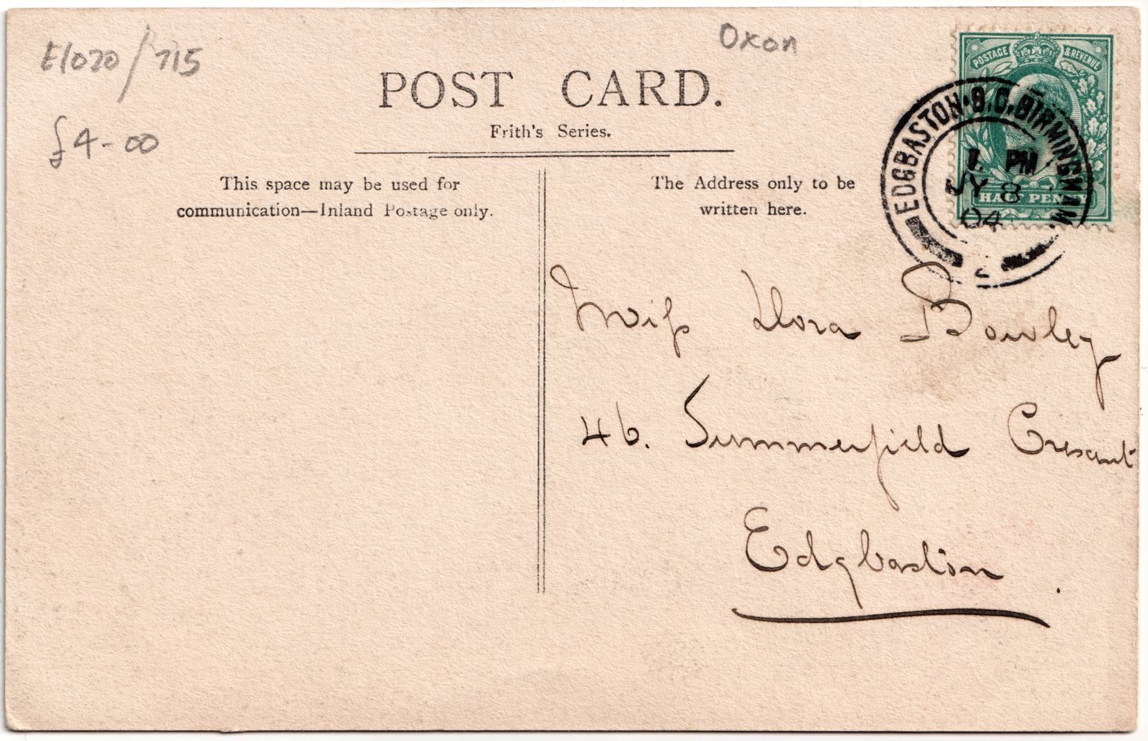 The Francis Frith Collection date this image to 1900. I'm not quite sure who this is addressed to. A Joseph Philip Bowley lives at this address in 1896 but that doesn't seem to match the unclear name on the card.