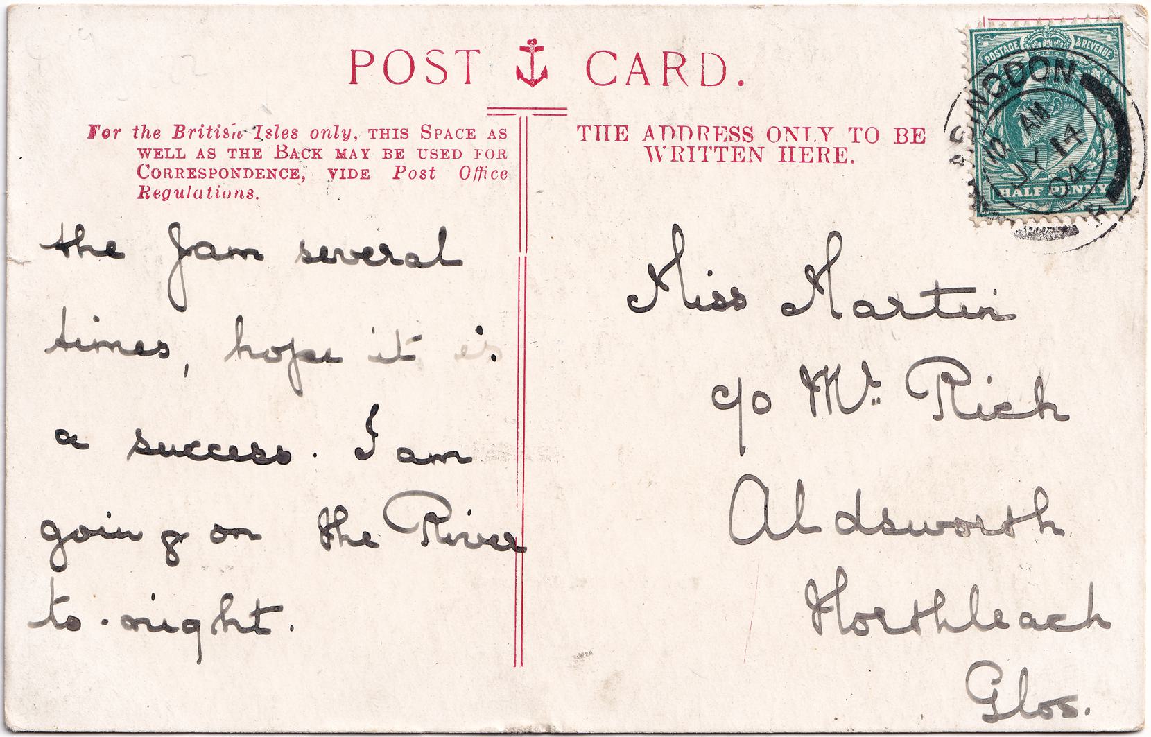 | Sent to | Miss Martin c/o Mr Rich, Aldsworth, Northleach, Glos |