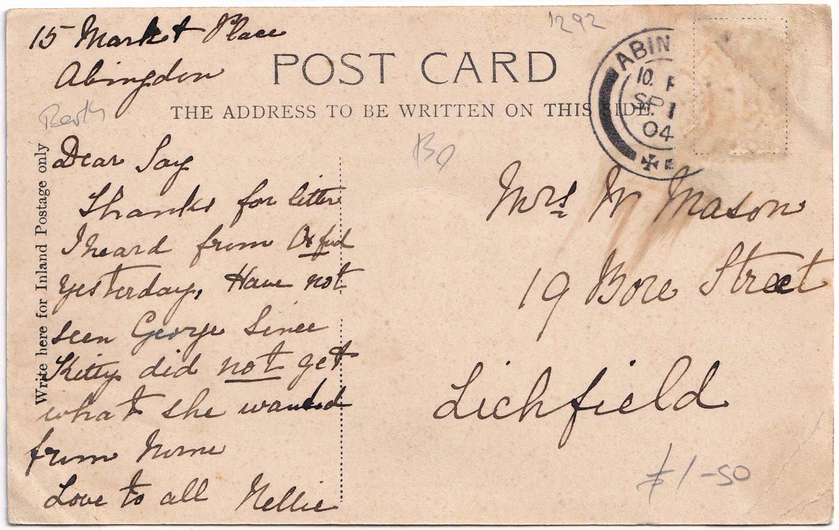 | Sent to | Mrs W Mason, 19 Bore Street, Lichfield |