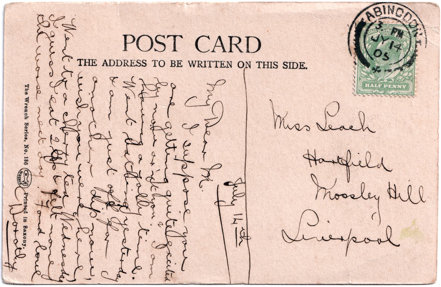 Hartfield was a mantion on Harthill Road, Liverpool. The recipient was likely working here as a domestic servant. Photograph appears to be taken by Frith's (45202) who date it to 1900. Duplicate of 19010717-AbingdonWrench186