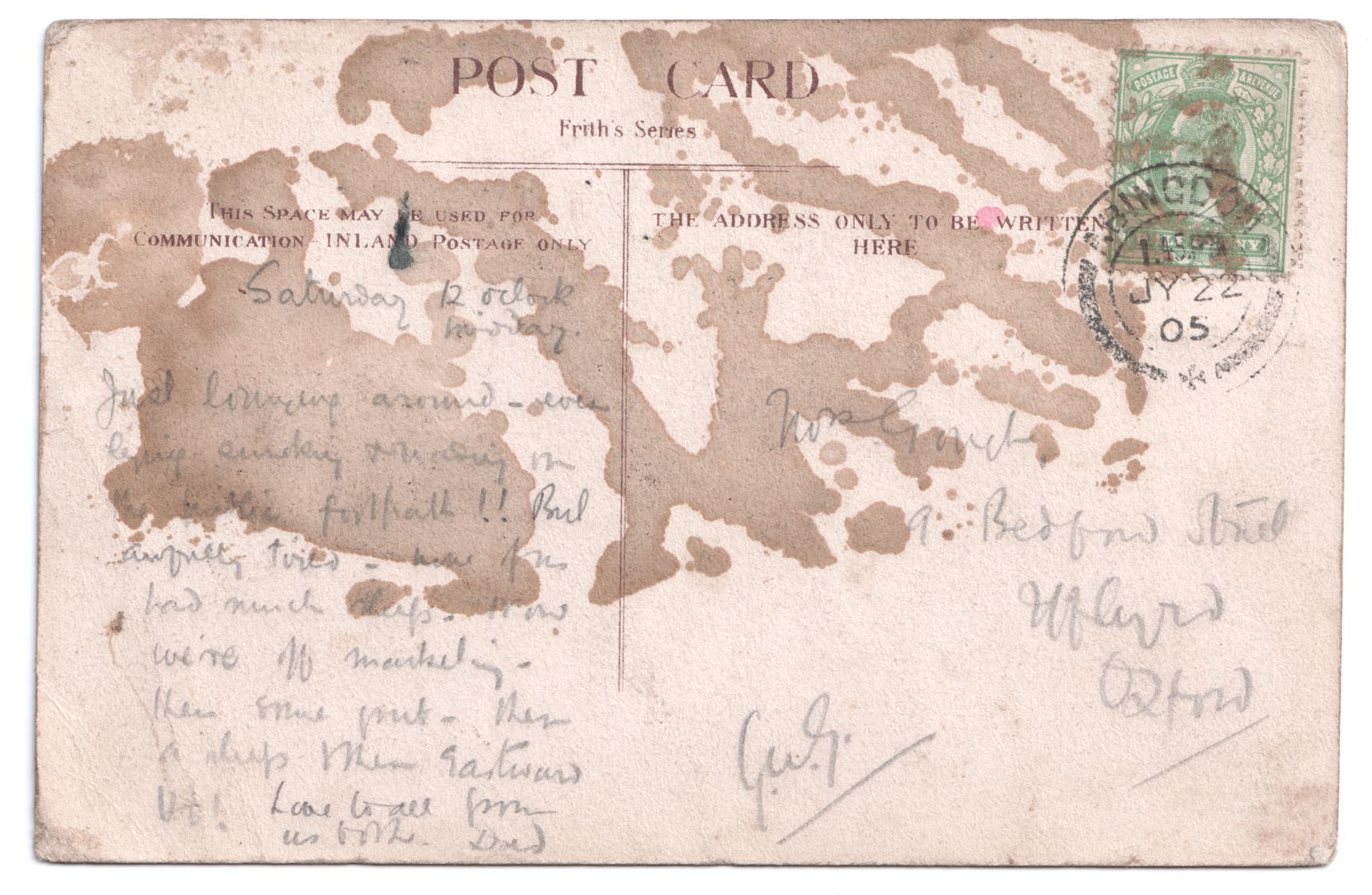 | Message | Saturday 12 o'clock midday. Just lounging around - ? footpath !! Butt ? had much chaps. Now we're off marketing then some ? then always then ? Love from us both, Dad |