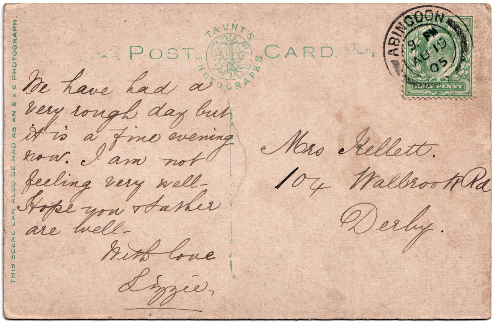 | Message | We have had a very rough day but it is a fine evening now. I am not feeling very well. Hope you and father are well. With love, Lizzie. |