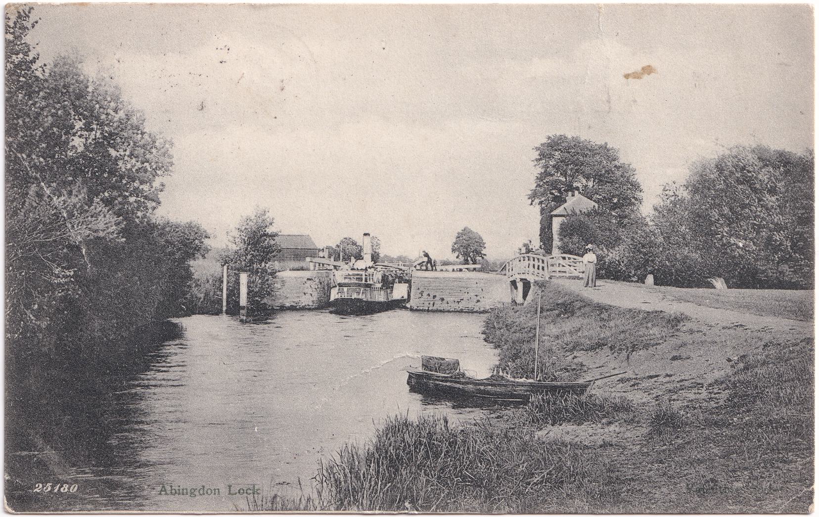 This photograph is paired with one that I've recorded as 25179 which appears to have been taken at the same time. In this image the steamer is exiting the lock, and a woman in Edwardian dress is watching a man open the lock gates.