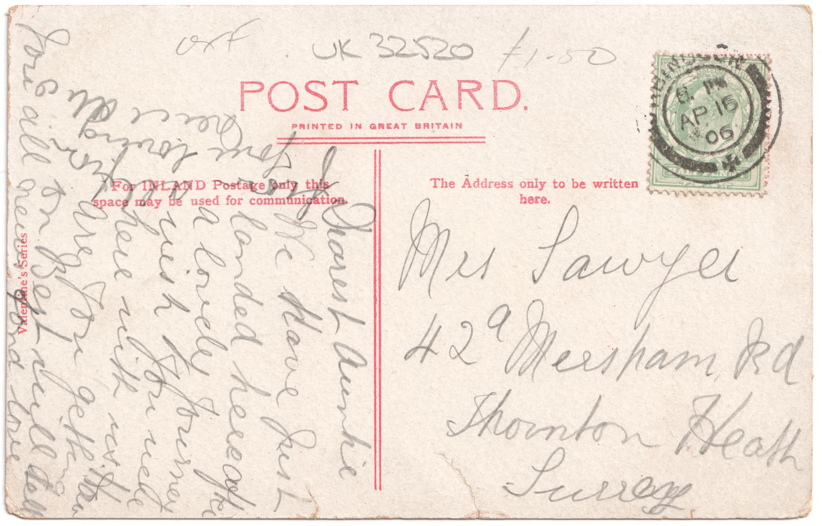 | Sent to | Mrs Sawyer, 42a Mersham Road, Thornton Heath, Surrey |