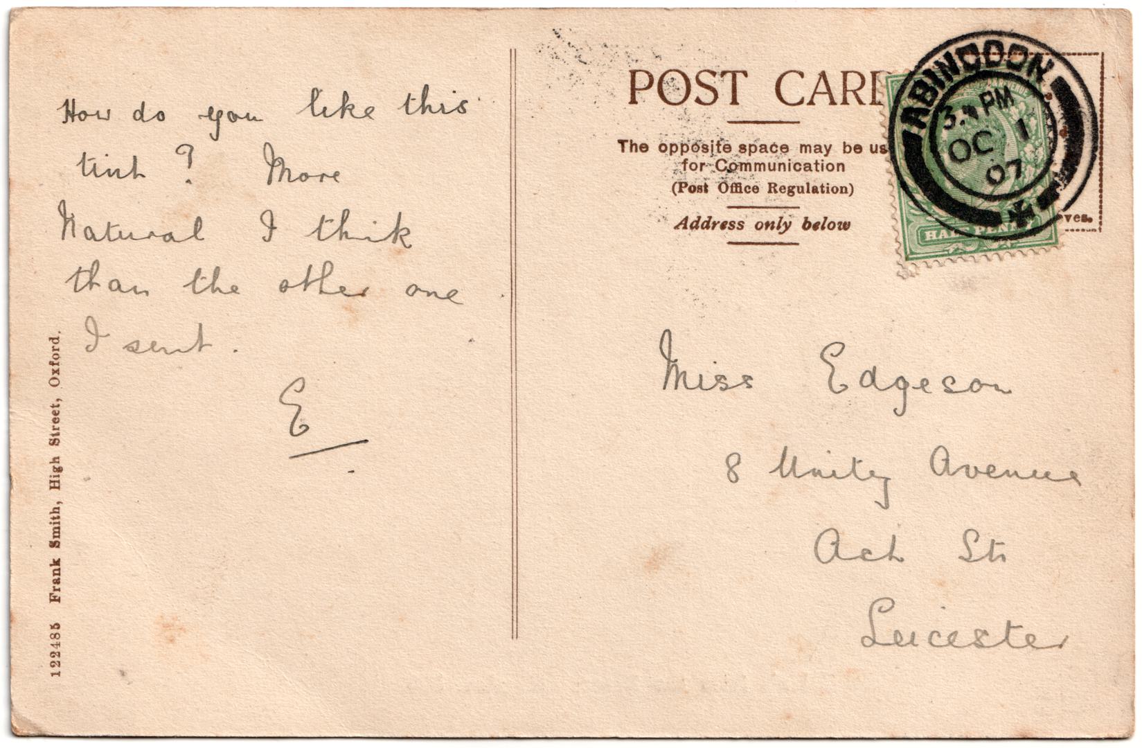 Sent from Edith Mary Barrett (b. 1884) of 12 Marcham Road, to Nellie Gamble Edgson. Edith's brother Paulin would marry Nellie in 1912.