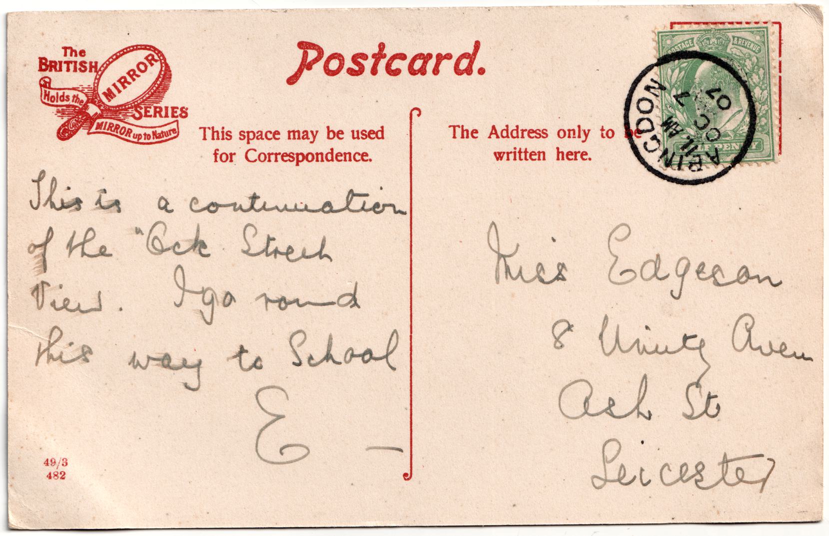 It's possible that there are further cards in this series out there. Other sites have a consistent number before the /. Sent by Edith Mary Barrett of 12 Marcham Road, to Nellie Gamble Edgson of Leicester. Edith's brother Paulin would marry Nellie in 1912.