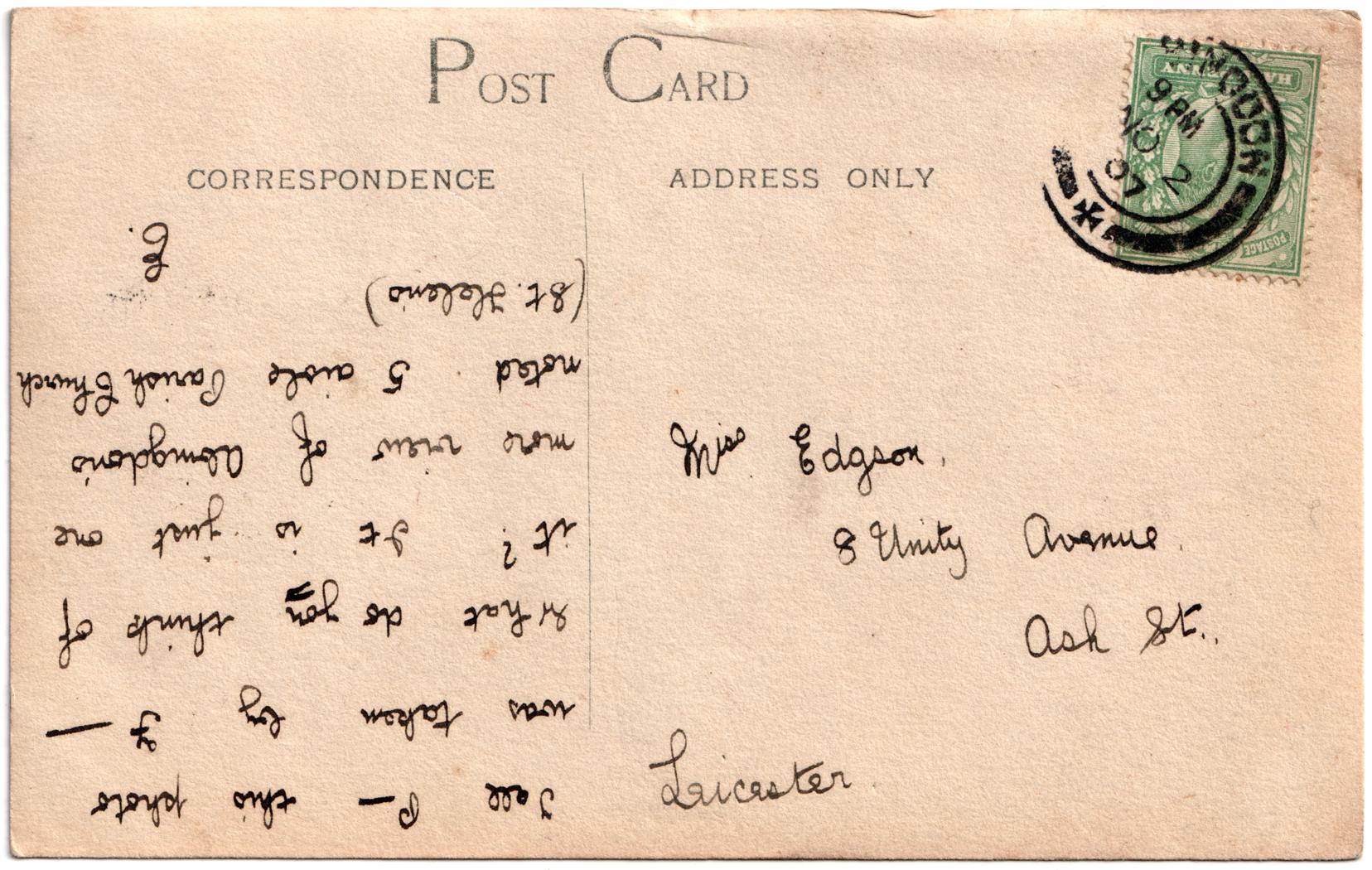 | Sent to | Miss Edgson, 8 Unity Avenue, Ash Street, Leicester |