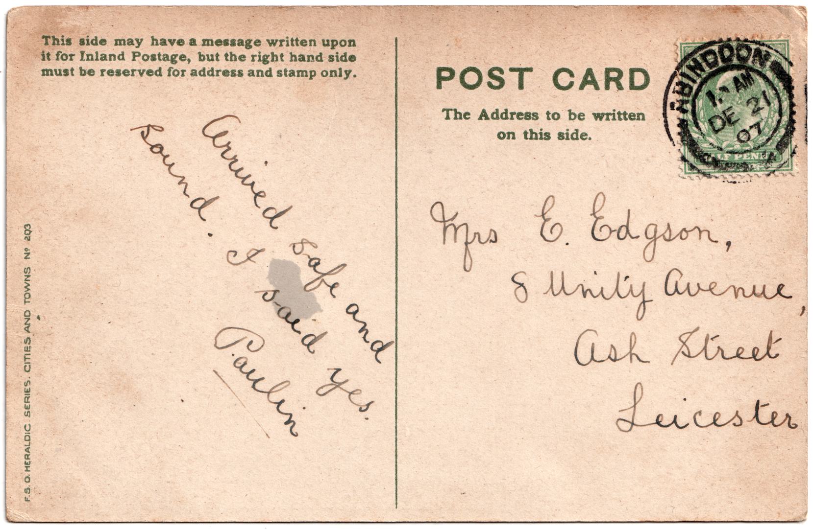 Sent from Paulin William Barrett (b. 1886) of 12 Marcham Road, to Nellie Gamble Edgson. Paulin and Nellie would marry in 1912.