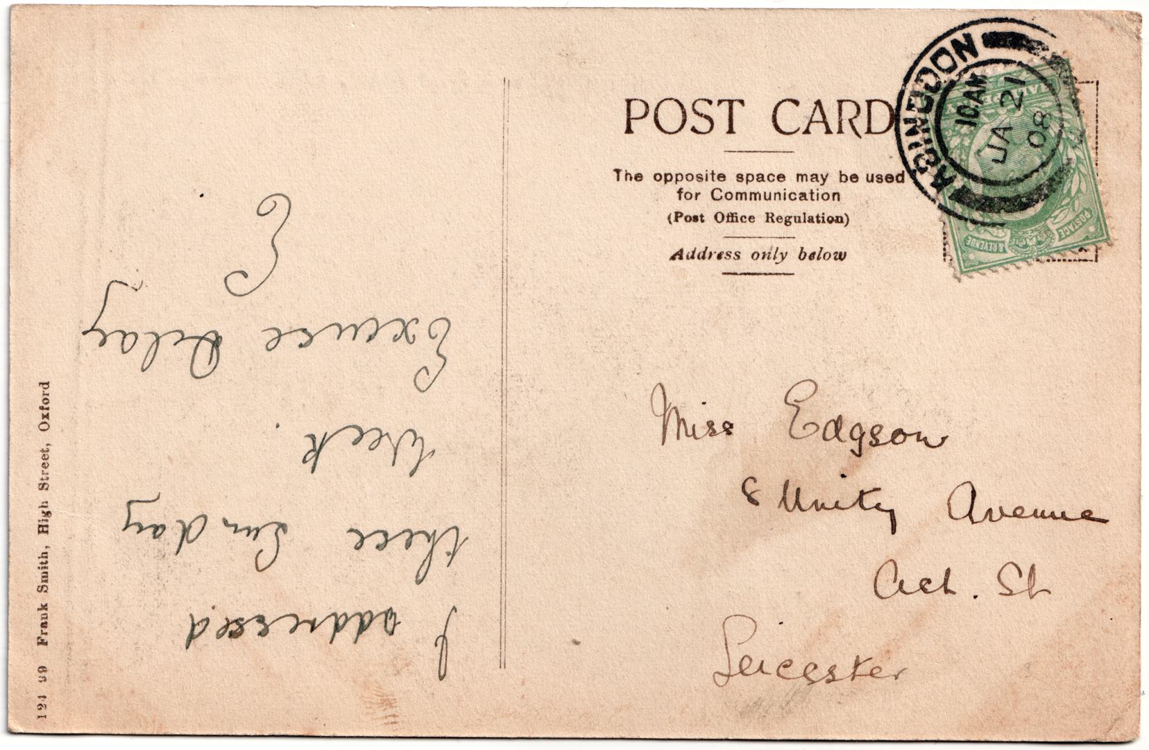 | Sent to | Miss Edgson, 8 Unity Avenue, Ash Street, Leicester |