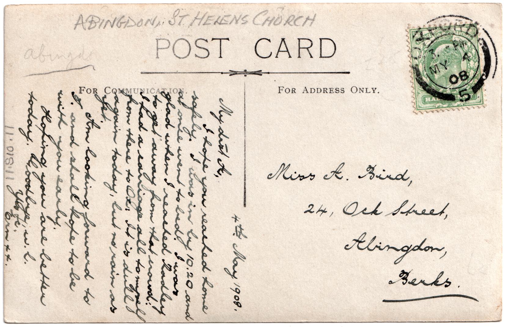 | Message | 4th May 1908. My dear A, I hope you reached home safely. I was in by 1.20 and at once went to bed. I was glad when I reached Radley to get away from that crwod! I had a carriage all to myself from there to Ox. It is dull again today, but no rain as yet. Am looking forwaqrd to T and shall hope to be with you early. Hoping you are better today. Googbyte, w.l, Yours, ? xx |