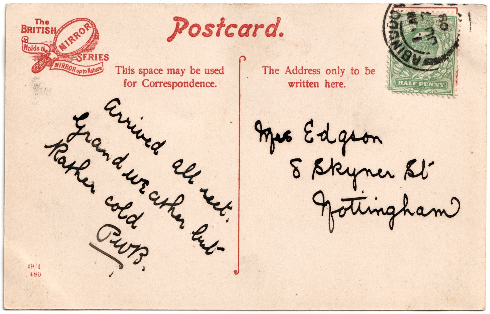 | Sent to | Mrs Edgson, 8 Skyner St. Nottingham |