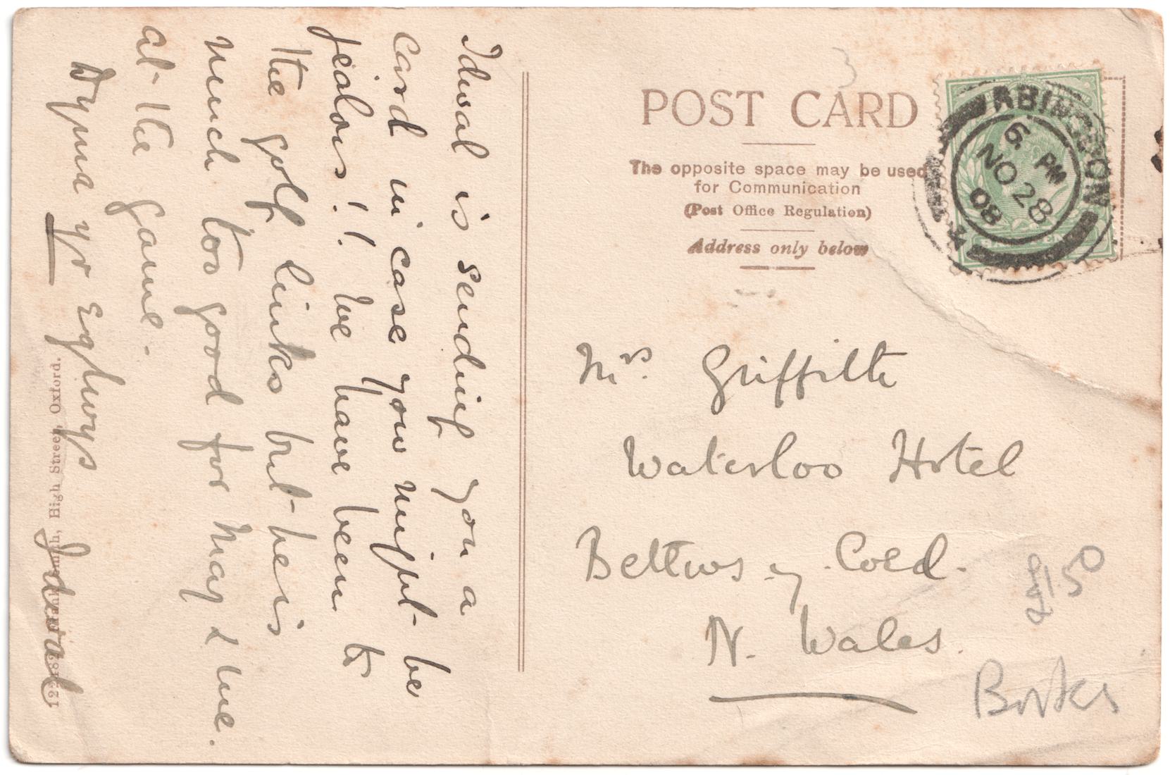 Idwal isn't the most common Welsh name. There's a record of an Idwal Owain Griffith marrying Alice Godfrey Isaac (daughter of TW Player Isaac of Barton Court) in Abingdon in 1909 and this is almost certainly the sender of this card. Idwal worked at the University of Oxford where he studied physics, astronomy, and spectroscapy. During the First World War he served in the Royal Flying Corps and RAF where he developed early night flying techniques. His obituary describes him has showing "sweet reasonableness and a patience" and that he enjoyed golf "where he was no mean performer".
