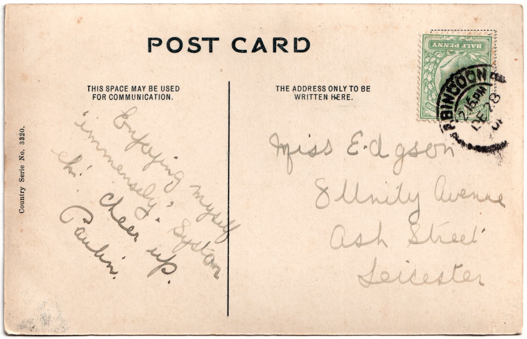 | Sent to | Miss Edgson, 8 Unity Avenue, Ash Street, Leicester |