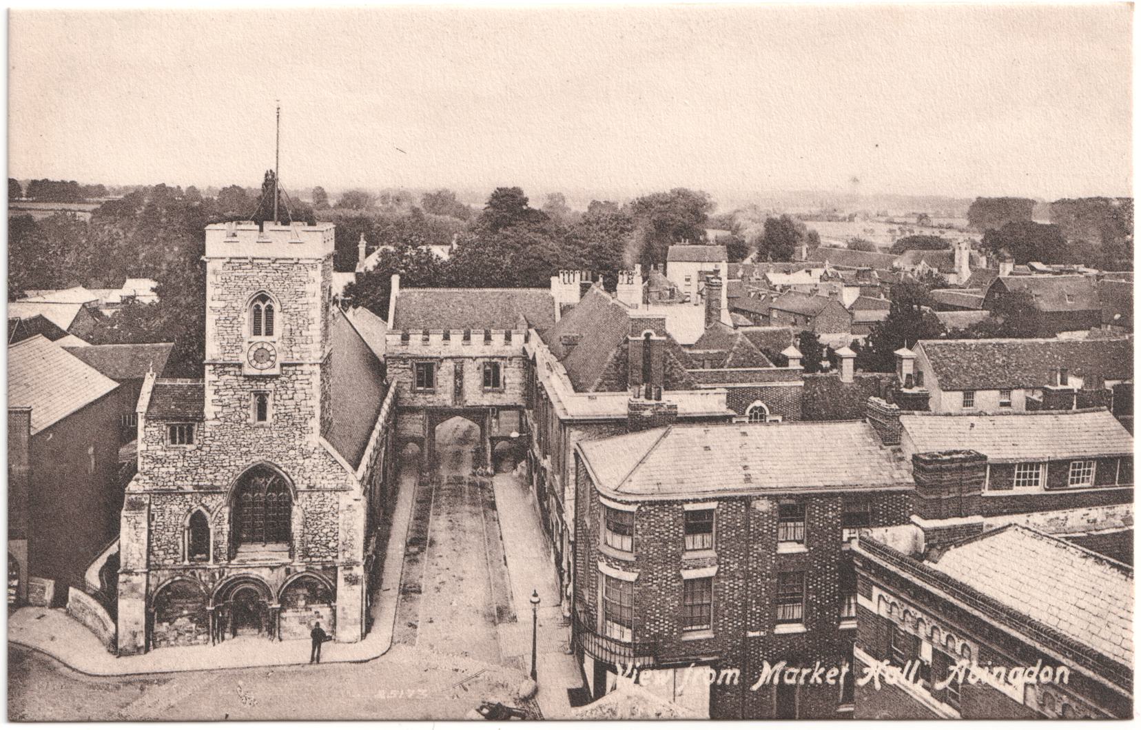 This unposted card has a serial number that dates it to 1896. Taken from the roof of the county hall, it shows a view towards the Abbey Gateway. The church clock looks like it reads as 10:25. The now demolished "Butcher's Row" that enclosed the guildhall courtyard is visible, as is the very edge of the building on Stert Street that was home to Warland Andrew's photo studio.