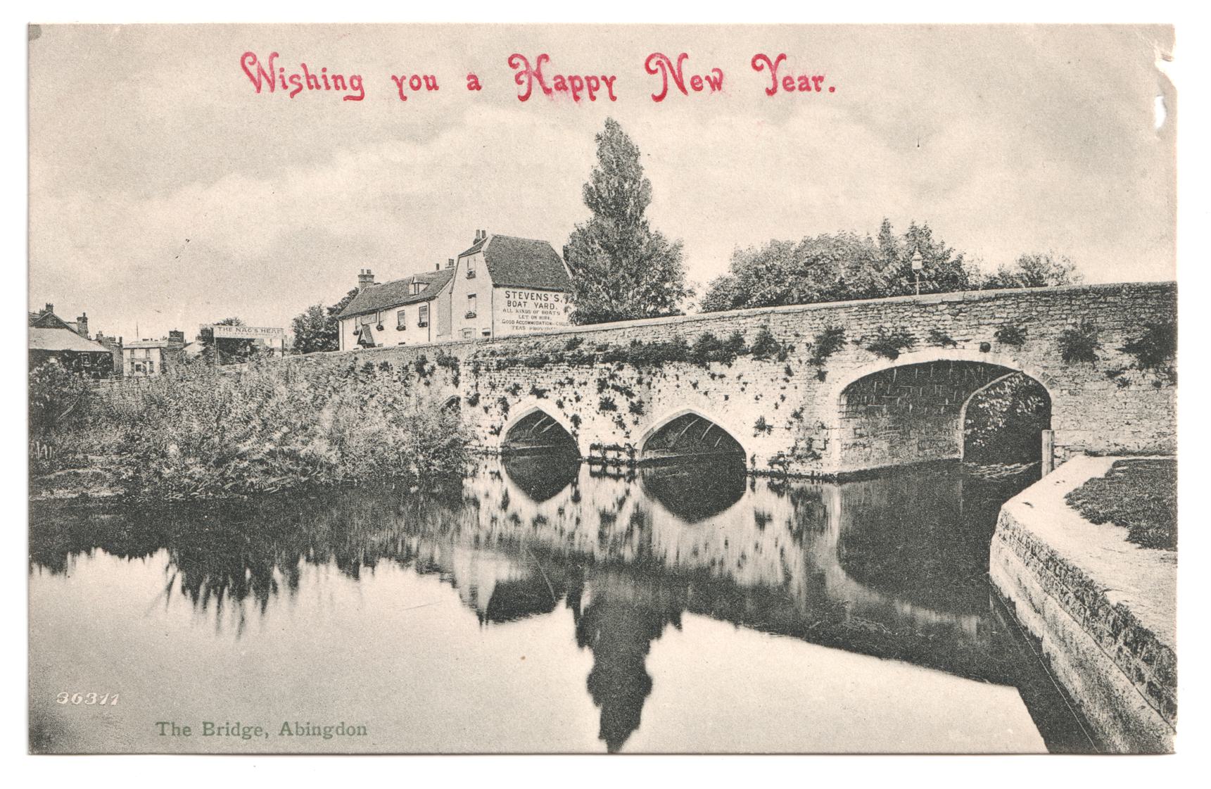 A view of the Bridge and Nag's Head as seen from downstream on the Thames Path. The writing on the side of the Nag's head reads 'Steven's Boat yard, all kinds of boat's let on hire. Good accomodation - cyclists. Teas provided.' There is also a sign reading 'The Nags Head' erected over the street. The changes in these signs are useful for dating other photographs. The photograph is dated to 1901. I have a posted version of this from 1903. This one has the 'Wishing you a Happy New Year' stamp over it, and the reverse shows signs of other cards bearing that stamp under it.